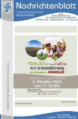 Hier finden Sie das Nachrichtenblatt mit amtlichen Bekanntmachungen der Verbandsgemeinde Maikammer und den Ortsgemeinden Kirrweiler, Maikammer und St. Martin. Jede Woche können Sie hier das neue Nachrichtenblatt als PDF Datei herunterladen.